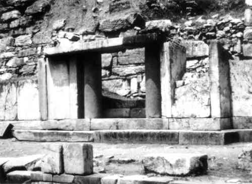 Portal de entrada al Templo Tardío con sus dos columnas monolíticas y el dintel blanco-negro. Obsérvese la excelente terminación de los bloques canteados ortogonalmente.